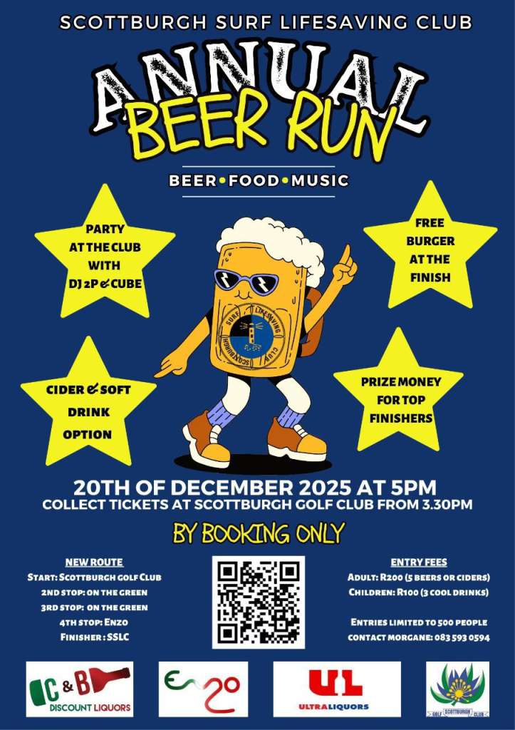 Annual Beer Run 0Likes Annual Beer Run Event Categories: 5km Walk/Run Things to do DescriptionBeer, Food, and Music. Party at the club with DJ 2P & CUBE. Free burger at the finish. Date: 20 December 2025 Time: 5PM (Collect tickets at Scottburgh Golf Club from 3:30PM) New Route: Start: Scottburgh Golf Club 2nd Stop: On the green 3rd Stop: On the green 4th Stop: Enzo Finisher: SSLC (Scottburgh Surf Lifesaving Club) Entry Fees: Adult: R200 (5 beers or ciders) Children: R100 (3 cool drinks) Additional Information: Cider & soft drink option available Prize money for top finishers By booking only Entries limited to 500 people Contact Information: Contact: Morgane Phone: 083 593 0594 Photos Map Loading... No Records Found Sorry, no records were found. Please adjust your search criteria and try again. Maps failed to load Sorry, unable to load the Maps API. Enter your locationGet Directions Travel modeDrivingWalkingBicyclingPublic Transport Distance unitsMilesKilometers Event Dates 20th December 2025, 5:00 pm-11:00 pm Event Categories: 5km Walk/Run Things to do Previous Next