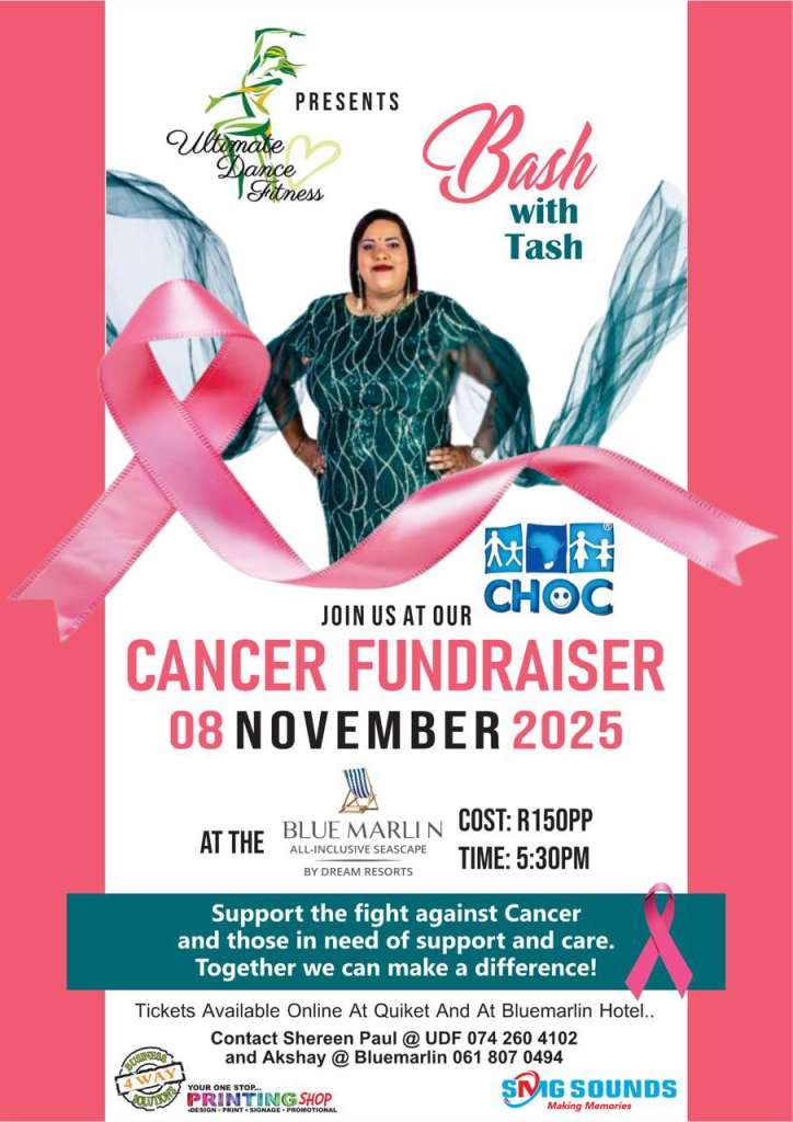 Bash with Tash – Cancer Fundraiser 0Likes Bash with Tash – Cancer Fundraiser Event Categories: Things to do Charity/Fundraiser DescriptionJoin us at our Cancer Fundraiser Support the fight against cancer and those in need of support and care. Together, we can make a difference! Date: 8 November 2025 Venue: Blue Marlin All-Inclusive Seascape Cost: R150 PP Time: 5:30PM Tickets available: Online at Quiket and at Blue Marlin Hotel Contacts: Shereen Paul @ UDF: 074 260 4102 Akshay @ Blue Marlin: 061 807 0494 Photos Map Loading... No Records Found Sorry, no records were found. Please adjust your search criteria and try again. Maps failed to load Sorry, unable to load the Maps API. Enter your locationGet Directions Travel modeDrivingWalkingBicyclingPublic Transport Distance unitsMilesKilometers Event Dates 8th November 2025, 5:30 pm-8:00 pm Event Categories: Things to do Charity/Fundraiser Previous Next