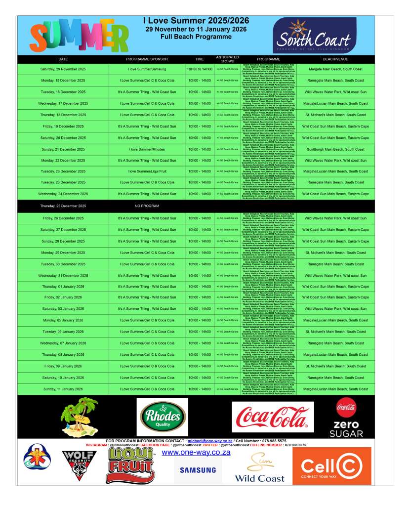 I Love Summer (Rhodes Edition) 0Likes I Love Summer (Rhodes Edition) Event Categories: Things to do Entertainment Family Fun DescriptionBeach Volleyball, Beach Soccer, Beach Touchies, Hula Hoop, Musical Freeze, Musical Chairs, Sand Castle Building, Treasure Hunt, Balloon Blow up, Cone Diving Competitions, to name but a few, all for sponsored prizes. Sponsor: Rhodes Date: Sunday, 21 December 2025 Time: 10H00 to 14H00 Location: Scottburgh Main Beach, South Coast Entry Fee/Restrictions: No Access Restrictions and FREE Participation for ALL. Anticipated Crowd: +/- 50 Beach Go’ers Photos Map Loading... No Records Found Sorry, no records were found. Please adjust your search criteria and try again. Maps failed to load Sorry, unable to load the Maps API. Enter your locationGet Directions Travel modeDrivingWalkingBicyclingPublic Transport Distance unitsMilesKilometers Event Dates 21st December 2025, 10:00 am-2:00 pm Event Categories: Things to do Entertainment Family Fun Previous Next