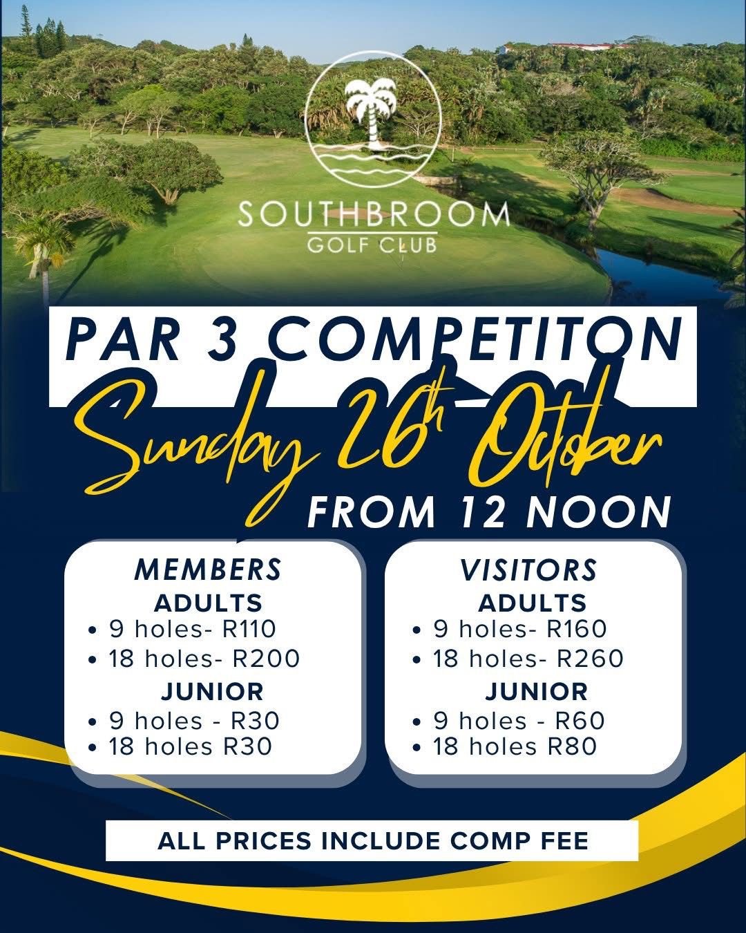 Southbroom Golf Club Par 3 Competition 0Likes Southbroom Golf Club Par 3 Competition Event Categories: Golf Days Things to do DescriptionDate: 26 October 2025 Venue: Southbroom Golf Club Time: From 12 Noon Pricing: MEMBERS: ADULTS: 9 holes – R110 18 holes – R200 JUNIOR: 9 holes – R30 18 holes – R30 VISITORS: ADULTS: 9 holes – R160 18 holes – R260 JUNIOR: 9 holes – R60 18 holes – R80 Important Note: All prices include comp fee Photos Map Loading... No Records Found Sorry, no records were found. Please adjust your search criteria and try again. Maps failed to load Sorry, unable to load the Maps API. Enter your locationGet Directions Travel modeDrivingWalkingBicyclingPublic Transport Distance unitsMilesKilometers Event Dates 26th October 2025, 12:00 pm-6:00 pm Event Categories: Golf Days Things to do Previous Next