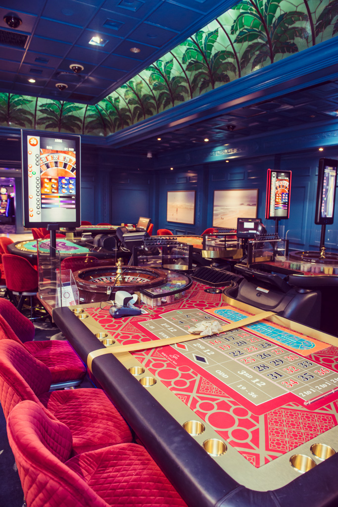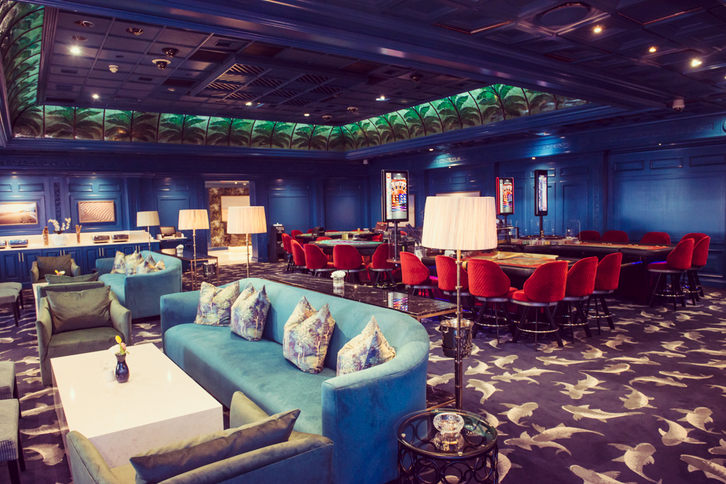 Fabrics are in cool colours to match the ocean, from the vibrant blue painted wall panelling and swimming fish carpet, which contrast with red velvet chairs. A touch of glamour is provided by the onyx marble backlit bar, tropical wall paper with palms, and gold Versace wallpaper. All the artwork is original, including an enormous canvas by Luke Batha in the slots area, commissioned especially for the project.